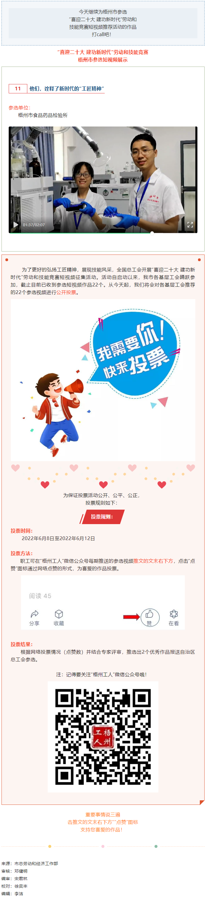 梧州市食品藥品檢驗(yàn)所參選作品丨“喜迎二十大 建功新時(shí)代” 勞動(dòng)和技能競(jìng)賽短視頻投票活動(dòng)開始啦!