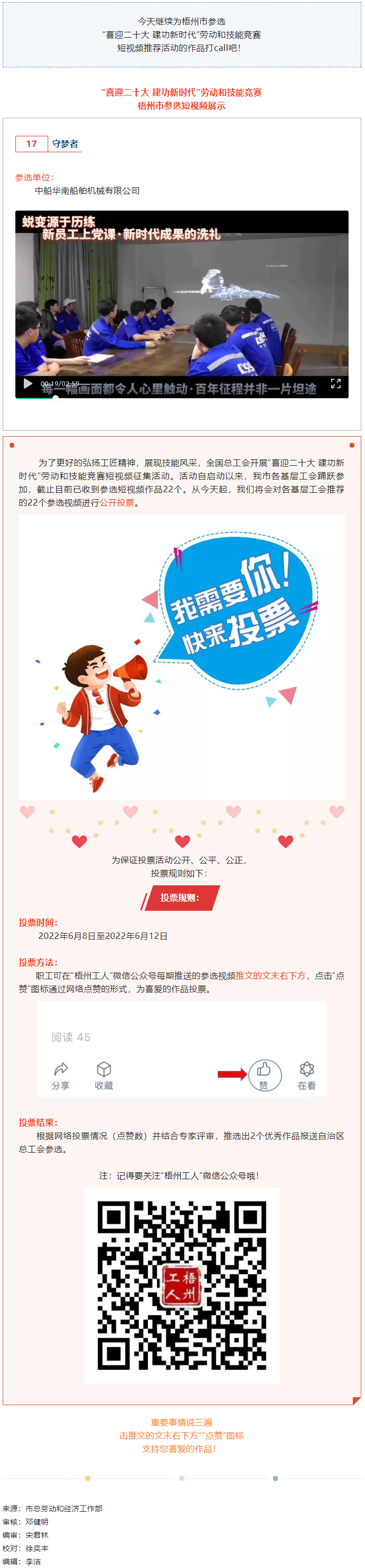 中船華南船舶機(jī)械有限公司參選作品(一)丨“喜迎二十大 建功新時(shí)代” 勞動和技能競賽短視頻投票活動開始啦!